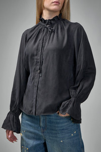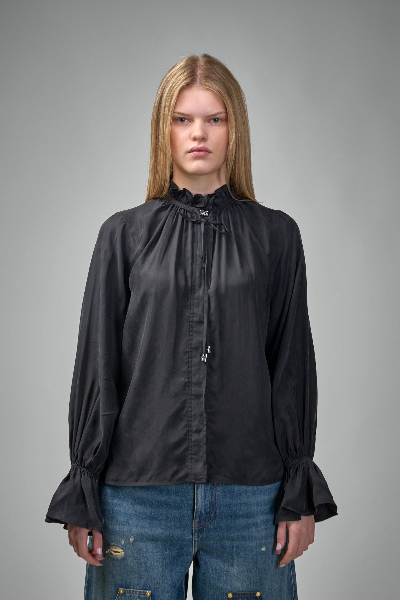 - high neckline - long voluminous sleeves - cuff detail - tie string design - GANNI Butterfly logo detail Materials: 60% cupro, 40% viscose Color: black SKU: 151655 Brand style: W0856 099 Size and Fit The model is 1.80m (5.9ft) and wears a size 36. The item has a looser cut but is not necessarily oversized. It’s intended for a comfortable and easy wear.