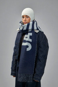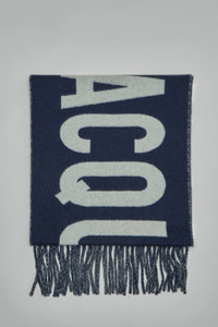 Knitwear scarf in deep navy blue with oversized contrasting light-grey lettering along its length. Woven knit fabric with twisted two-tone fringes and visible stitched hems for a graphic, cozy finish. Materials: 100% Wool Color: blue SKU: 152513 Brand style: ACU00435AOT4001990