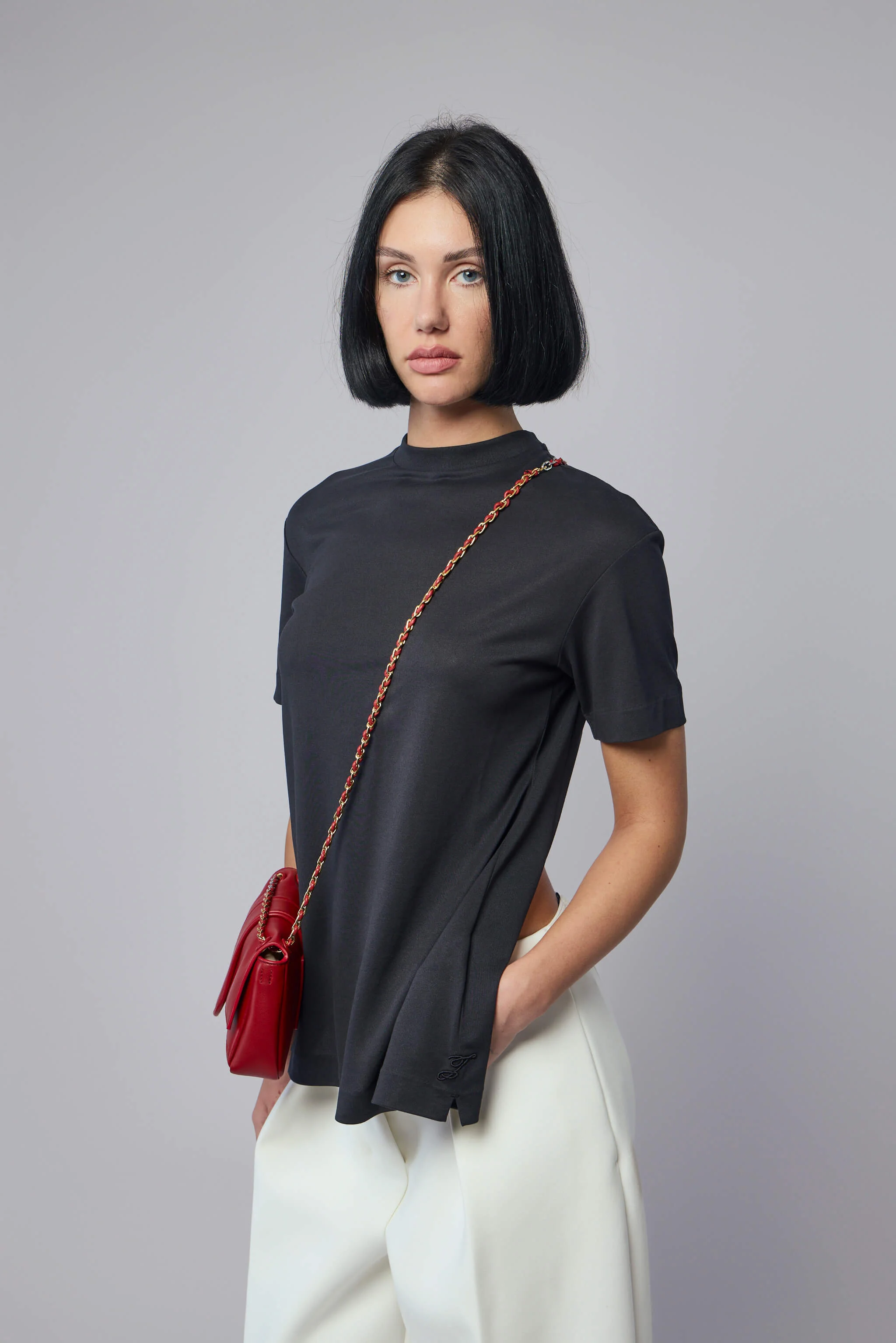 SKU: 153729 Brand style: 26ETSW00589AJ00254 T-shirt with a sleek design featuring a high neckline and a relaxed silhouette. The garment offers short sleeves and falls to a straight hem, ideal for a casual yet polished look. - High neckline - Short sleeves - Relaxed fit - Straight hem - Plain design Materials: Main Fabric: 57% Paper, 43% Polyester Second Fabric: 54% Paper, 41% Polyester, 5% Elastane Color: Black The model is 1.75m (5.7ft) and wears a size XS. The item fits as expected according to standard sizing. Order your usual size.