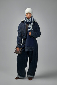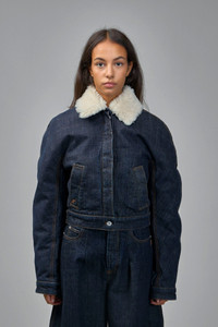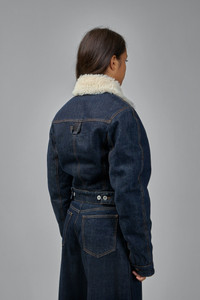 Jacket in dark indigo denim with a cream shearling collar, cropped hem and button-front fastening. It has visible contrast topstitching, silver-tone buttons and an adjustable back waist tab for a fitted silhouette. Materials: 100% Cotton Color: navy SKU: 152467 Brand style: 241DE041-1513-38B Size and Fit The model is 1.76m (5.8ft) and wears a size 34. Designed with a wide, box-like shape, generally not following body contours.