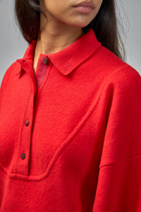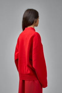 Sweater in bright red with a polo-style collar and a four-button placket. The oversized knit features dropped shoulders, a curved yoke seam and a ribbed hem for a relaxed silhouette. Materials: 90% Merino Wool, 10% Cashmere Color: red SKU: 152472 Brand style: SWM00609AK00276470 Size and Fit The model is 1.76m (5.8ft) and wears a size 36. The item has a looser cut but is not necessarily oversized. It’s intended for a comfortable and easy wear.