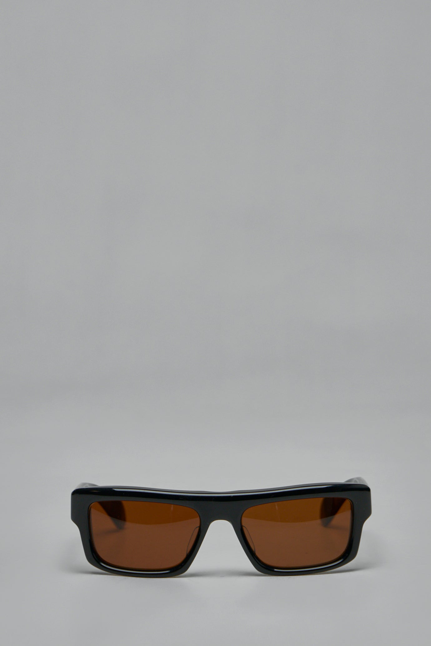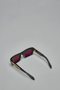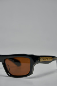 A pair of sunglasses features a sleek design with dark frames and warm-toned lenses. These stylish glasses offer a contemporary look suitable for various occasions. The design incorporates intricate details on the arms, adding to its unique appeal. Materials: 100% Acetate, 100% Titanium Color: dark gold SKU: 147559 Brand style: JMMVNX-11D