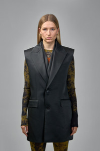 Sleeveless longline blazer vest with structured shoulders and a double-breasted front. It features satin-effect lapels, flap pockets, and a back center vent. Materials: 92% Acetate, 8% Polyester Color: black SKU: 151591 Brand style: 25-03-w-ja008-w000-00 Size and Fit The model is 1.76m (5.8ft) and wears a size 36. The item fits as expected according to standard sizing. Order your usual size.