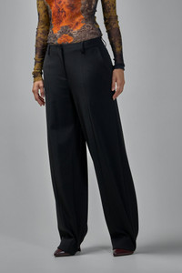 Wide-leg pants in black woven suiting fabric with pressed center creases and a high waist. Features belt loops, a concealed front fly and double welt back pockets with buttons. Floor-grazing full-length silhouette finished with rear hem slits. Materials: 94% Polyamide, 6% Elastane Color: black SKU: 151592 Brand style: 25-03-w-tr003-w002-00 Size and Fit The model is 1.76m (5.8ft) and wears a size 36. The item fits as expected according to standard sizing. Order your usual size.