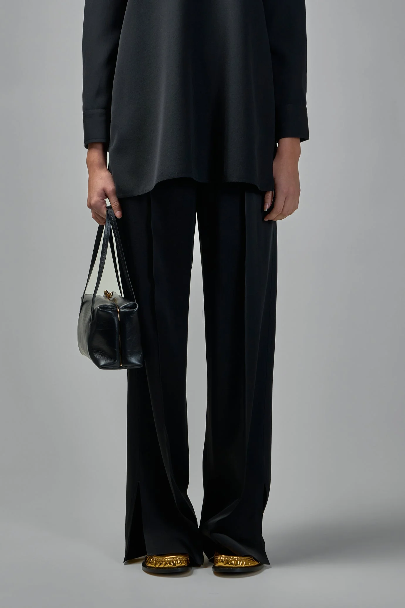 Wide-leg pants featuring a sleek design with a high elastic waistband. The pants offer a flowing silhouette suitable for both casual and formal occasions. Materials: 74% acetate, 26% viscose Color: black SKU: 151182 Brand style: J02KA0180J76018001