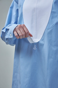 - long and relaxed fit - back button closure at neck - stand collar and cuffs - classic plastron detail embroidered Jil Sander monogram striped cotton poplin Materials: 100% cotton Color: blue sky Made in Italy SKU: 146113 Brand style: J05DL0106 JTN237 471 Size and Fit The model is 1.80m (5.9ft) and wears a size 38