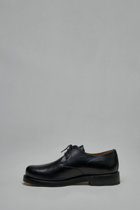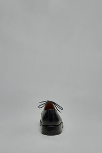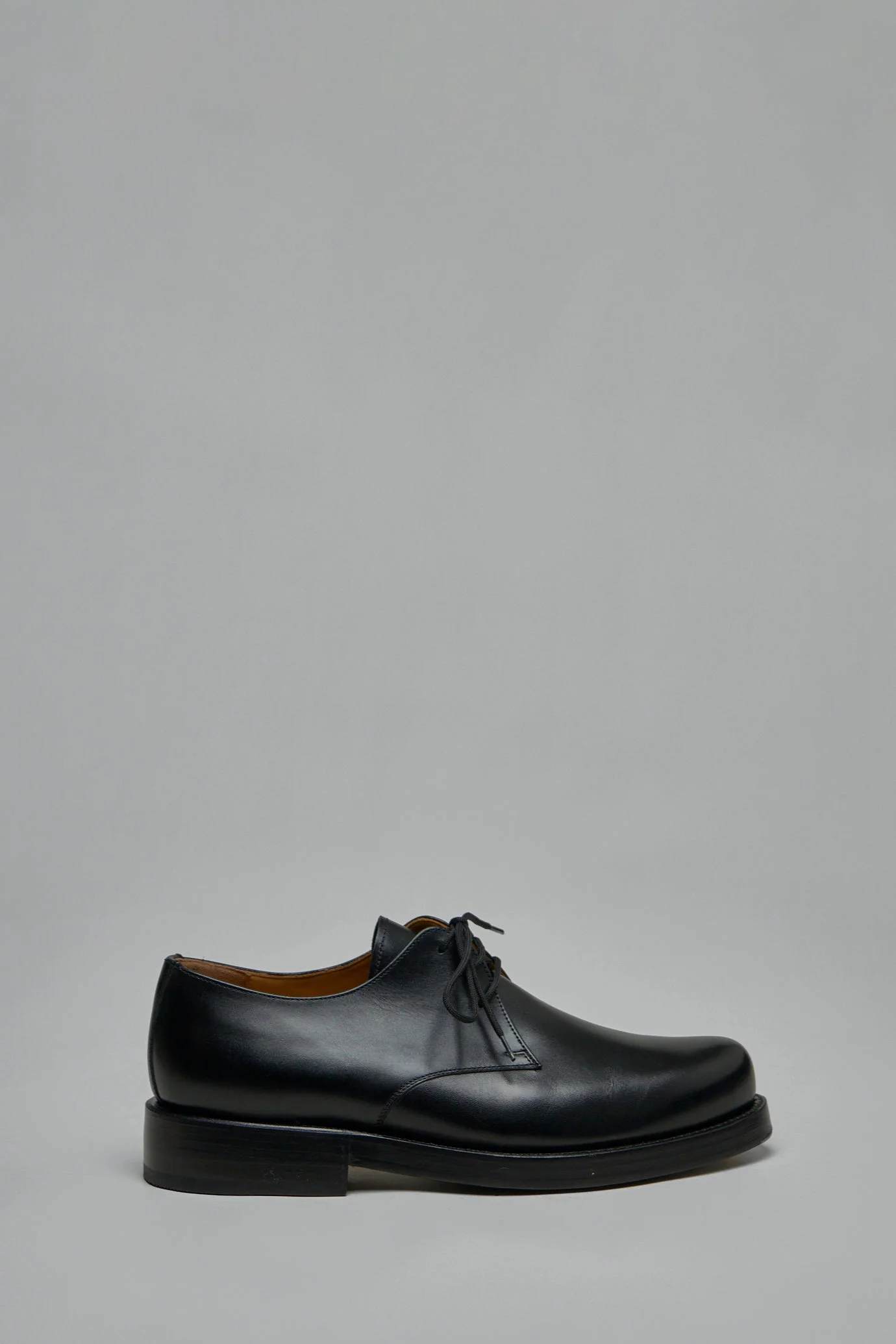 Lace-up leather shoe with a sleek rounded toe and low stacked heel. It features a smooth black leather upper, tonal stitching, round laces, and a visible tan leather interior lining. Materials: 100% Leather Color: black SKU: 153338 Brand style: WP-K106-W25
