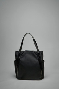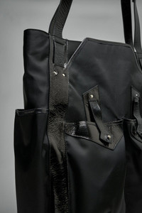 - paneled construction - twin shoulder straps - patch pockets and post-stud tabs at face - patch pocket at sides - zip closure - zip pocket and patch pockets at interior - nylon taffeta lining - 45,5 x 38 x 15 cm Materials: 100% leather Color: black SKU: 148658 Brand style: KKSS25BG02-155