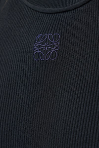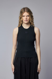 SKU: 153885 Brand style: S359Y55K51 Sleeveless tank top made from a ribbed fabric, featuring a high round neckline and a small embroidered logo on the chest. - Sleeveless design - Ribbed fabric texture - Small chest logo - High round neckline - Fitted silhouette Materials: 92% Viscose, 4% Polyamide, 4% Polyester Color: Black