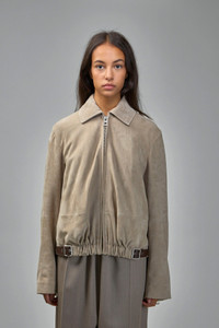 Leather jackets with a turn-down collar, gathered elastic hem and adjustable buckle straps. It has a metal front zipper, zippered sleeve cuffs and a small embossed logo patch at back. Materials: 100% Leather Color: beige SKU: 152727 Brand style: S540Y34L58 Size and Fit The model is 1.76m (5.8ft) and wears a size 36. The item fits as expected according to standard sizing. Order your usual size.