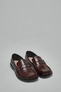 Loafer with a glossy croc-embossed vamp and a smooth black heel counter. It features a penny-strap, moc-toe stitching and a low stacked heel for a refined silhouette. Materials: 100% Leather Color: dark brown SKU: 151952 Brand style: MLSC290X01