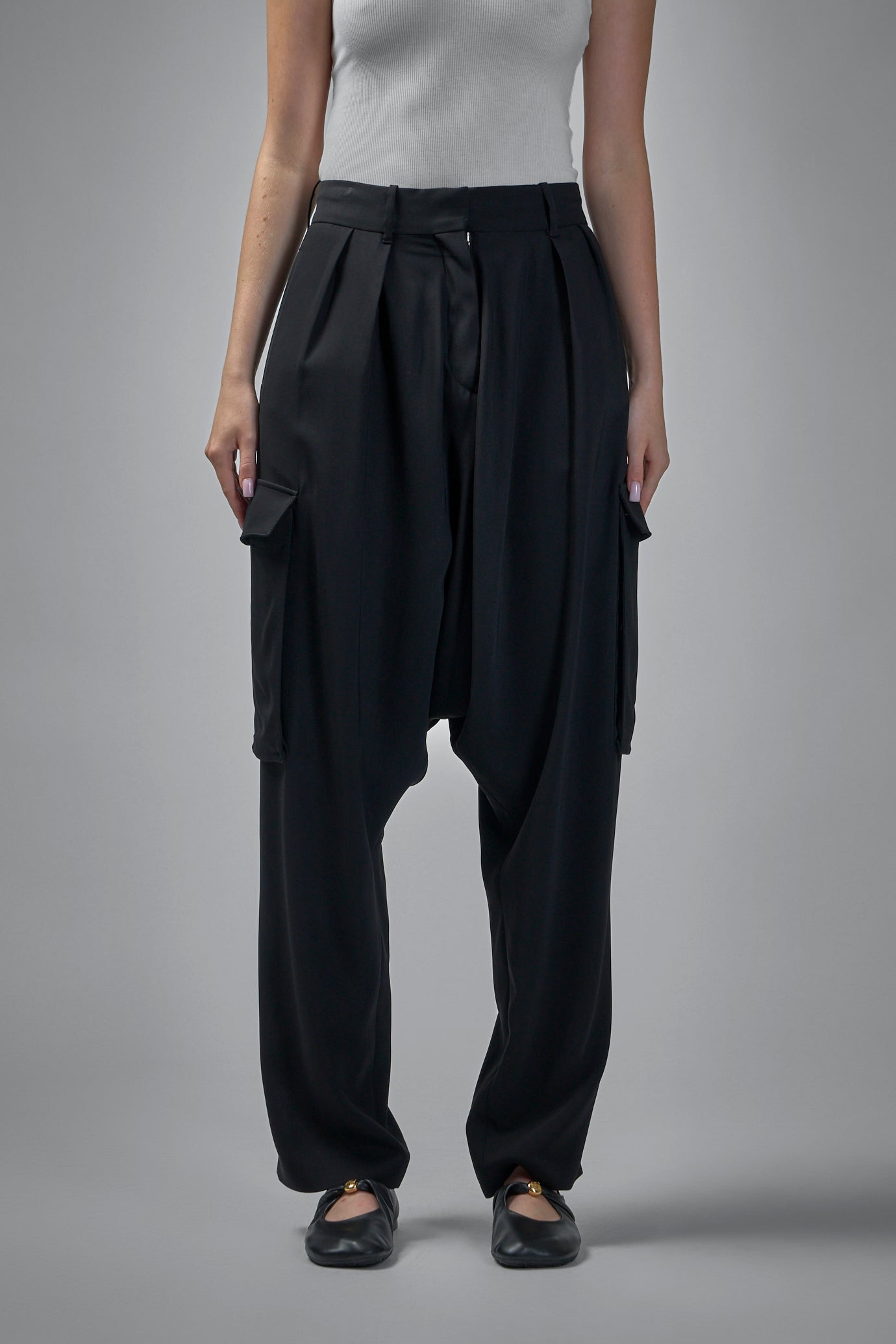 Baggy, relaxed silhouette with a modern, streetwear-inspired aesthetic. Cargo pockets add a utilitarian flair, complemented by a sleek, smooth fabric that enhances movement and comfort. Materials: 94% Viscose, 6% Elastane Color: black SKU: 151935 Brand style: s359y04xgi1100 Size and Fit The model is 1.80m (5.9ft) and wears a size 36.