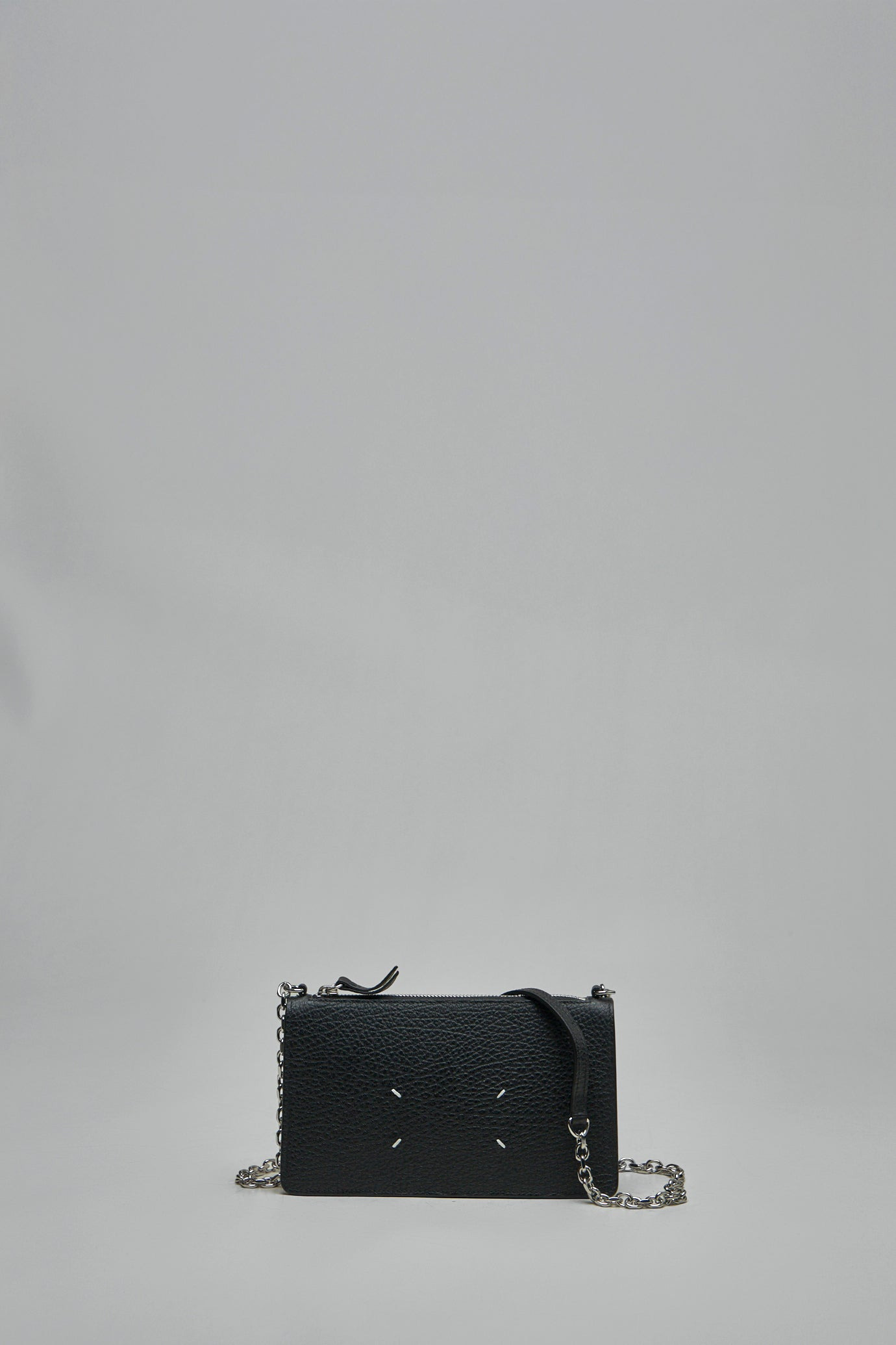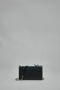 Crossbody bag in black pebbled leather with a rectangular compact silhouette. It features a silver chain shoulder strap with a leather pad, a top zip closure with leather pull, and four small white stitch details on the front. Materials: 100% Bovine Leather Color: black SKU: 151497 Brand style: SA1VL0038P4455