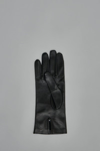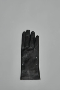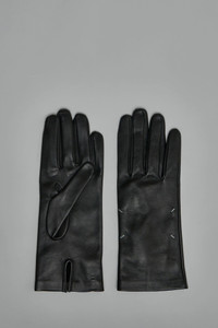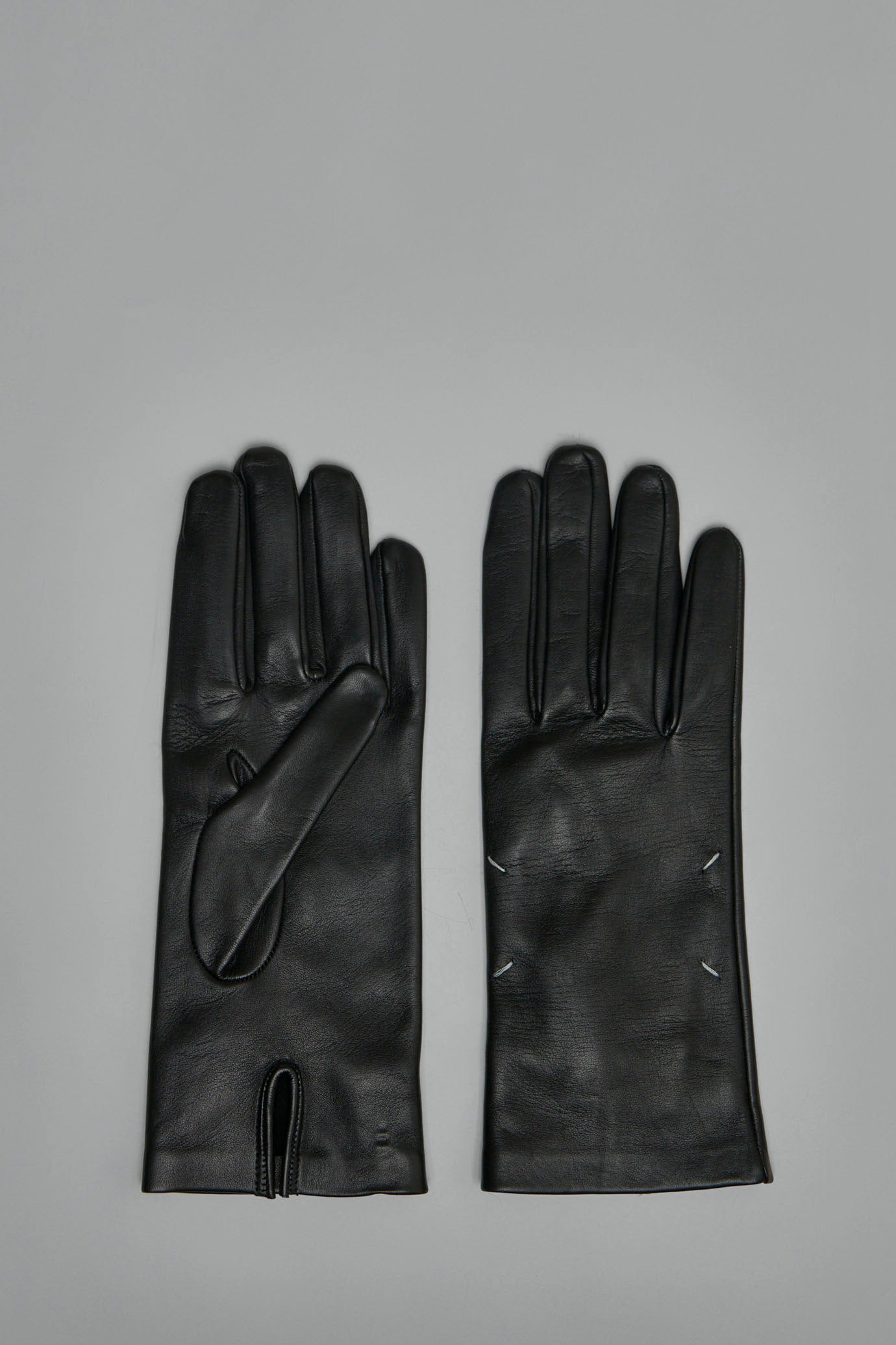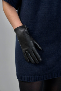 Black leather glove with a smooth matte finish and an elongated wrist-length cut. It has four small contrasting white stitch accents on the back and slim, tailored fingers with visible seam detailing. Clean, minimal topstitched cuff and refined silhouette. Materials: 100% Ovine Leather Color: 900 SKU: 151503 Brand style: S51TS0074SY1622