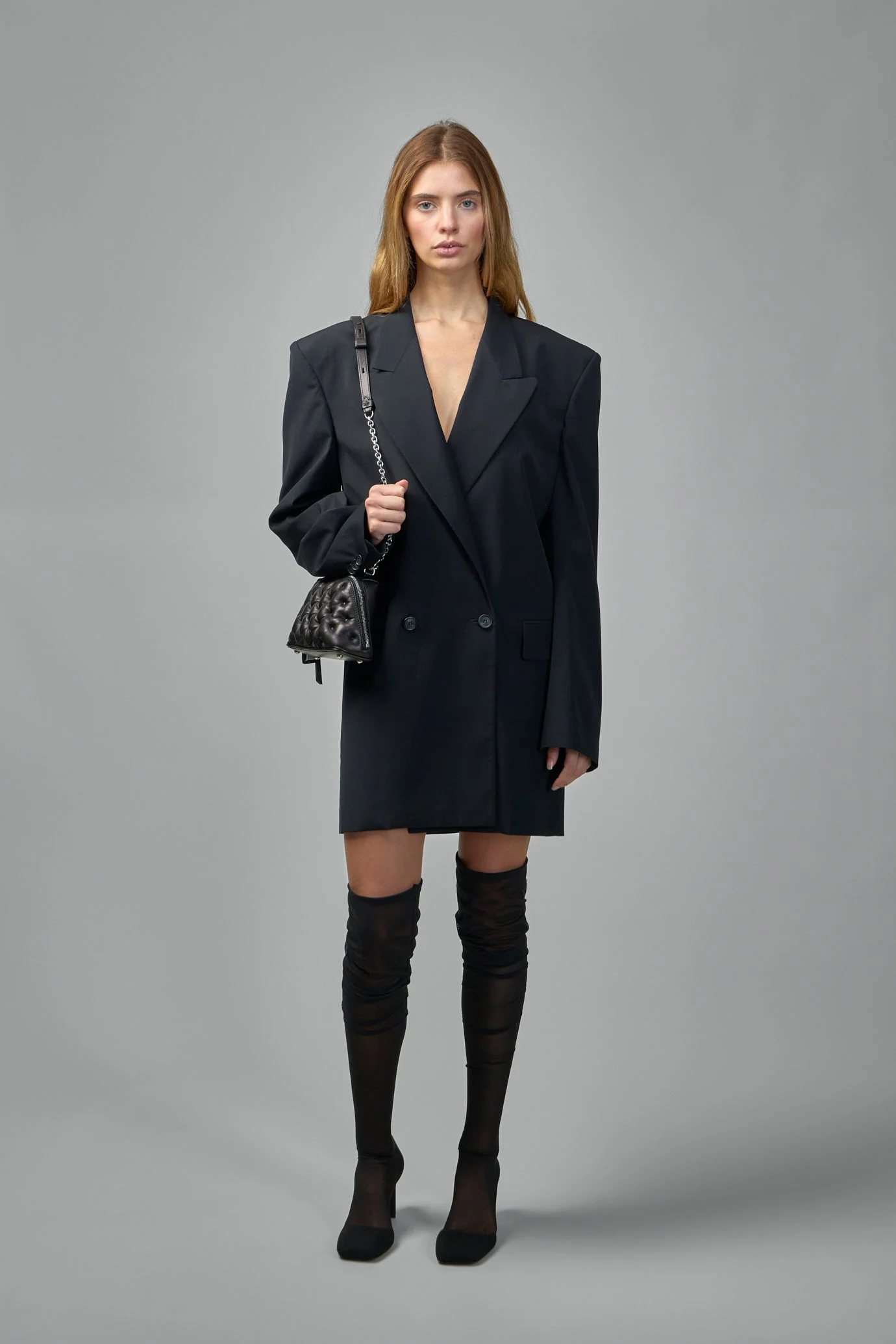 Blazer featuring an oversized fit, exuding modern style. This black double-breasted blazer has a sharp, structured silhouette with a deep V-neckline. Materials: Virgin Wool 60%, Polyamide 40% Color: black SKU: 154382 Brand style: S62BN0117-M35614-900