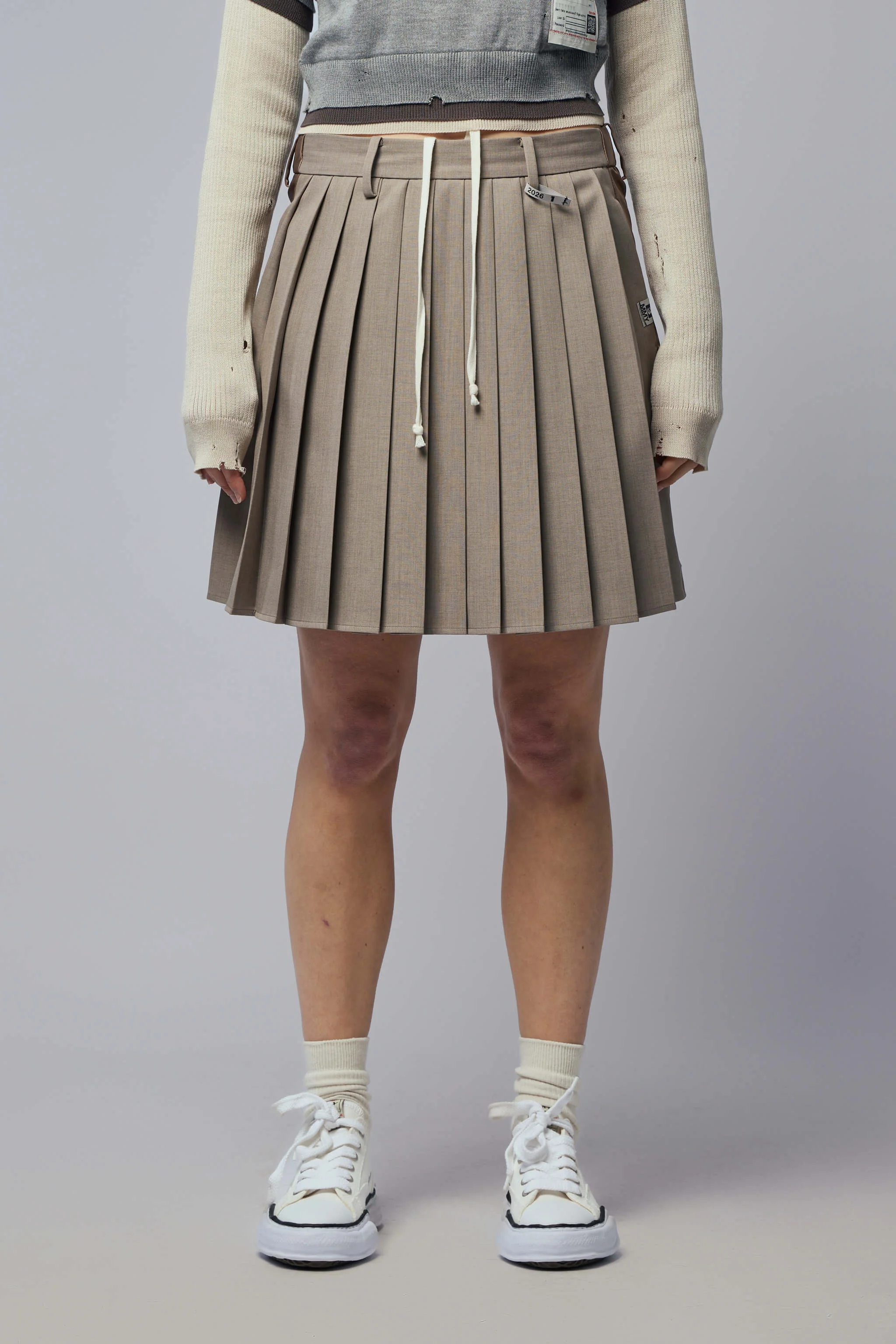 SKU: 154788 Brand style: B16PT042 Pleated skirt featuring a structured design and drawstring detail. The skirt has a two-tone appearance with a smooth back and pleated front. - Pleated front - Structured design - Drawstring detail - Two-tone appearance - Smooth back panel - Mid-length skirt Materials: Surface A: 100% Polyester, Surface B: 100% Polyester Color: Beige The model is 1.77m (5.8ft) and wears a size EU36. The item fits as expected according to standard sizing. Order your usual size.