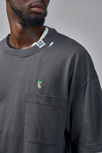 T-shirt in washed charcoal grey with an oversized relaxed fit. Features a patch chest pocket, small embroidered green duck motif and layered hem with contrasting white trim. The crewneck shows intentional distressing and a small brand tag at the collar. Materials: Cotton Color: black SKU: 152386 Brand style: A15TS641