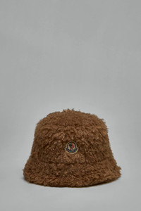 Hat in curly faux-shearling with a bucket silhouette. The plush brown piece features a short downward brim and a rounded mid-height crown with dense textured pile. Materials: 73% Cotton, 27% Nylon Color: off-white SKU: 153053 Brand style: 251111F015002