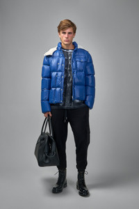 Down jacket in glossy blue with an attached padded hood and contrasting white inner lining. It has square quilted baffles, a central zip with a snap-button placket, and a chest flap pocket with a snap closure. Materials: 100% Nylon Color: black SKU: 151022 Brand style: K20911A00064596XE Size and Fit The model is 1.86m (6.1ft) and wears a size 2. The item fits as expected according to standard sizing. Order your usual size.