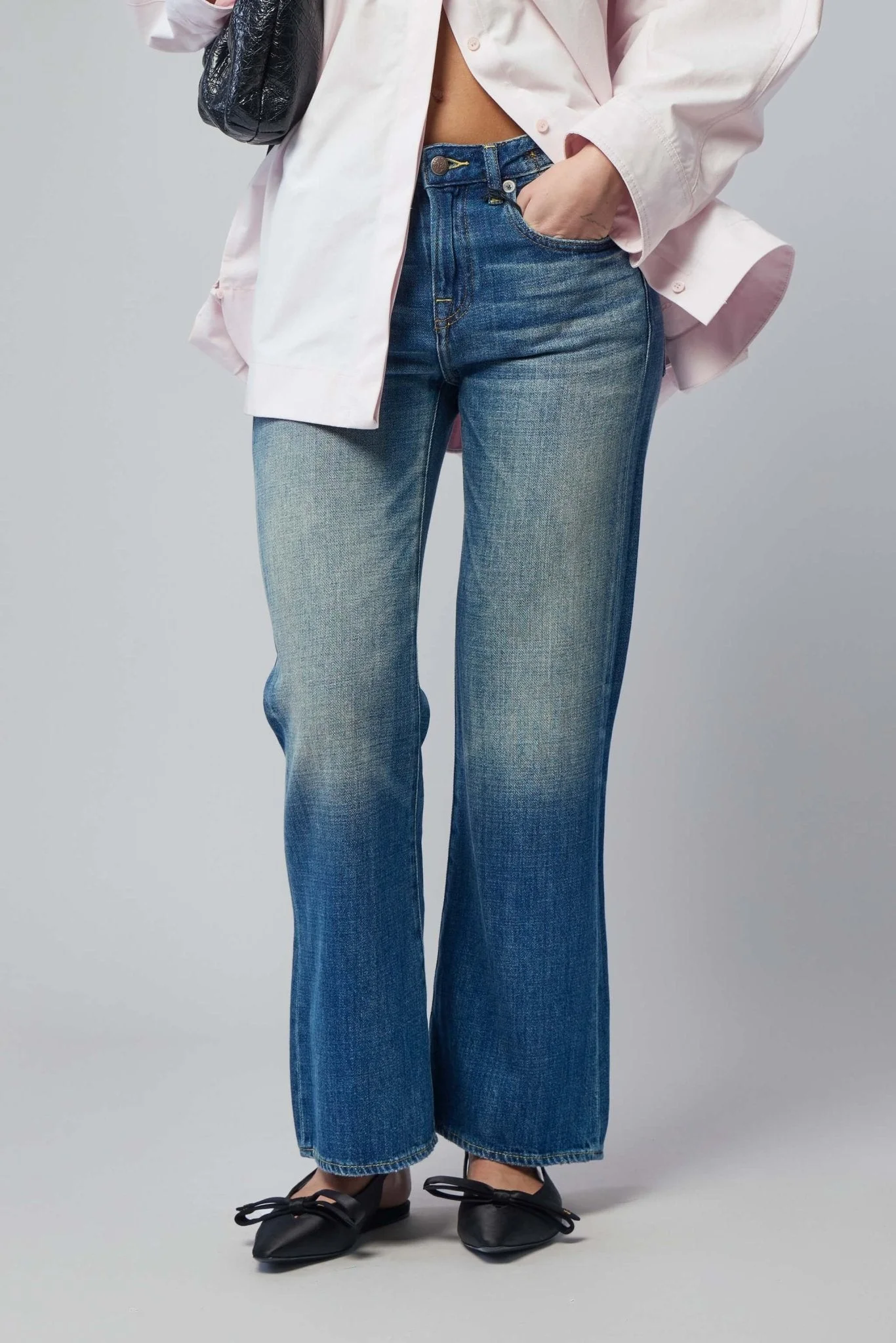 SKU: 155377 Brand style: R13WD200-D380B Flared Pants in a classic medium blue wash, featuring a subtle faded effect. These jeans are crafted with five-pocket styling and a standard button closure. - Flared leg silhouette - Medium blue wash - Subtle faded effect - Five-pocket styling - Standard button closure - Belt loops visible - Riveted front pockets - Contrast stitching Materials: 100% Cotton Color: Raine Blue The model is 1.75m (5.7ft) and wears a size 26. The item fits as expected according to standard sizing. Order your usual size.