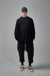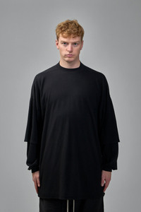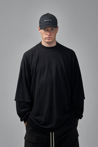 T-shirt in an oversized silhouette with a layered short-sleeve over long-sleeve construction. It has a crew neckline, dropped shoulders, and long sleeves with gathered cuffs. The piece is solid black with a straight hem falling to mid-thigh. Materials: 100% Cotton Color: black SKU: 152592 Brand style: DU02E7266-JDB-09 Size and Fit The model is 1.89m (6.2ft) and wears a size Onesize. The item has a looser cut but is not necessarily oversized. It’s intended for a comfortable and easy wear.