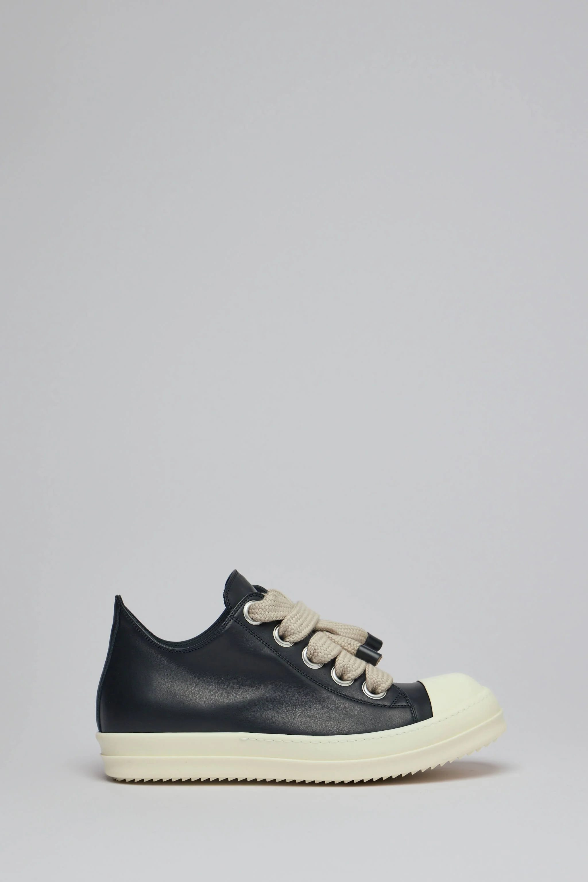 SKU: 155058 Brand style: RU01F2893 LCOW2 911 Low top sneakers with a sleek design, featuring oversized laces and a durable leather upper. The shoes have a textured rubber sole for added grip. - Low top design - Oversized beige laces - Black leather upper - Rubber cap toe - Textured rubber sole - Metal eyelets - Contrasting white sole Materials: 100% Leather Upper, 100% Rubber Sole Color: black Tends to fit bigger than standard sizing. Consider ordering a size down.