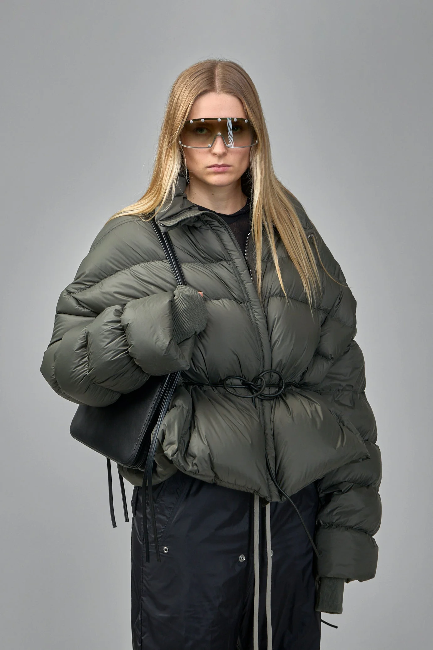 Down puffer jacket with oversized quilting and a cinched waist. It has a high stand collar, central zipper closure and long voluminous sleeves with ribbed inner cuffs for a cropped, boxy silhouette. Materials: 100% Nylon Color: fawn brown SKU: 152557 Brand style: RP02D3769NPD4 Size and Fit The model is 1.76m (5.8ft) and wears a size Onesize. The item has a looser cut but is not necessarily oversized. It’s intended for a comfortable and easy wear.