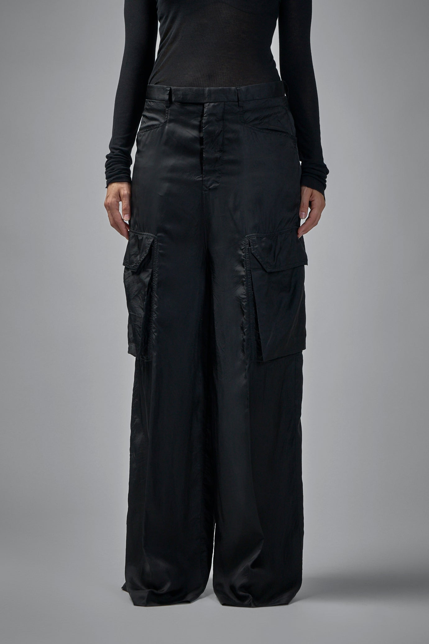 Wide, flowing silhouette creates a relaxed, utilitarian style. The large cargo pockets add a functional yet fashionable element. The smooth, slightly shiny texture enhances the modern, sleek aesthetic. Materials: 100% Cotton Color: black SKU: 152563 Brand style: RP02E4354 K 09 Size and Fit The model is 1.76m (5.8ft) and wears a size 42. The item has a looser cut but is not necessarily oversized. It’s intended for a comfortable and easy wear.