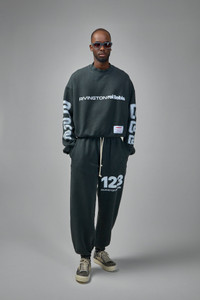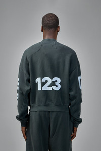 Sweatshirt in dark charcoal green with a boxy, cropped fit and dropped shoulders. It features a white printed logo across the chest, bold graphic prints down both sleeves, and a small rectangular patch above the hem. Finished with a ribbed crew neckline, ribbed cuffs and an elasticated hem. Materials: 100% Cotton Color: jet black SKU: 153125 Brand style: metc-cn00 Size and Fit The model is 1.89m (6.2ft) and wears a size L. Designed with a wide, box-like shape, generally not following body contours.