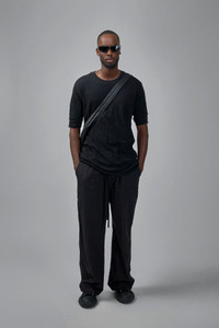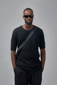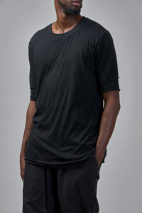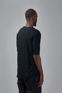 T-shirt in solid black with a relaxed, elongated silhouette. It has a crew neckline, dropped shoulders and elbow-length sleeves with folded hems. A visible raw stitch detail sits at the upper back and the fabric drapes lightly. Materials: 100% cotton Color: black SKU: 151704 Brand style: M TS 892