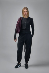 Textural interest from a fitted silhouette with a cropped cut, showcasing a v-neckline. The textured fabric adds depth, while the button closure enhances its stylish appeal. Ideal for layering or wearing alone, it offers versatility in styling. Materials: 100% wool Color: black SKU: 151470 Brand style: WJ212