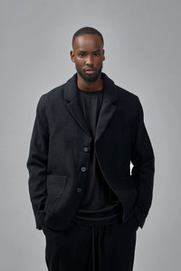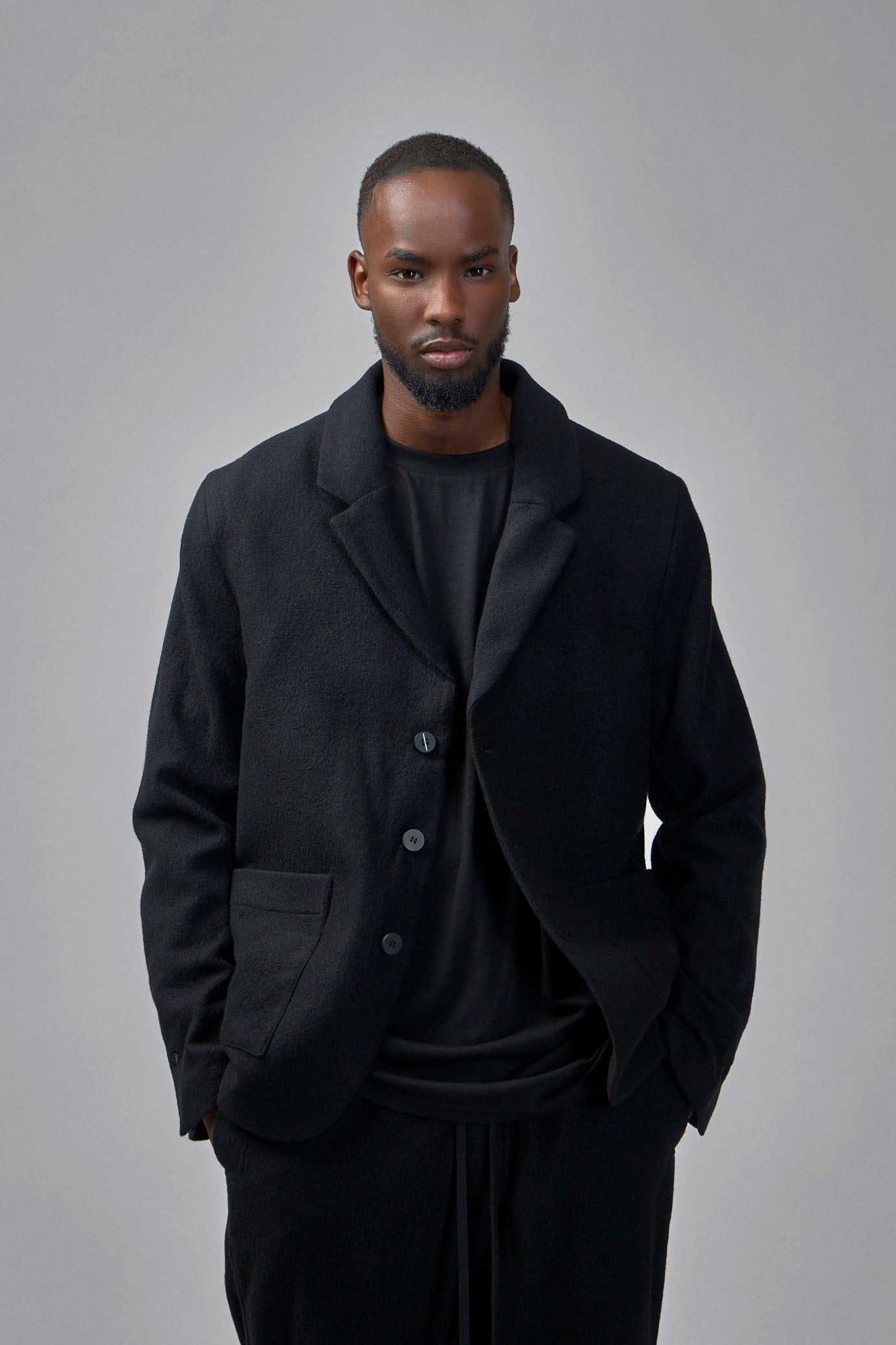 Blazer in black with a relaxed silhouette and notch lapel. It features a single-breasted three-button closure, patch front pockets, and a subtly textured fabric for a casual tailored look. Color: black SKU: 151414 Brand style: M B 62