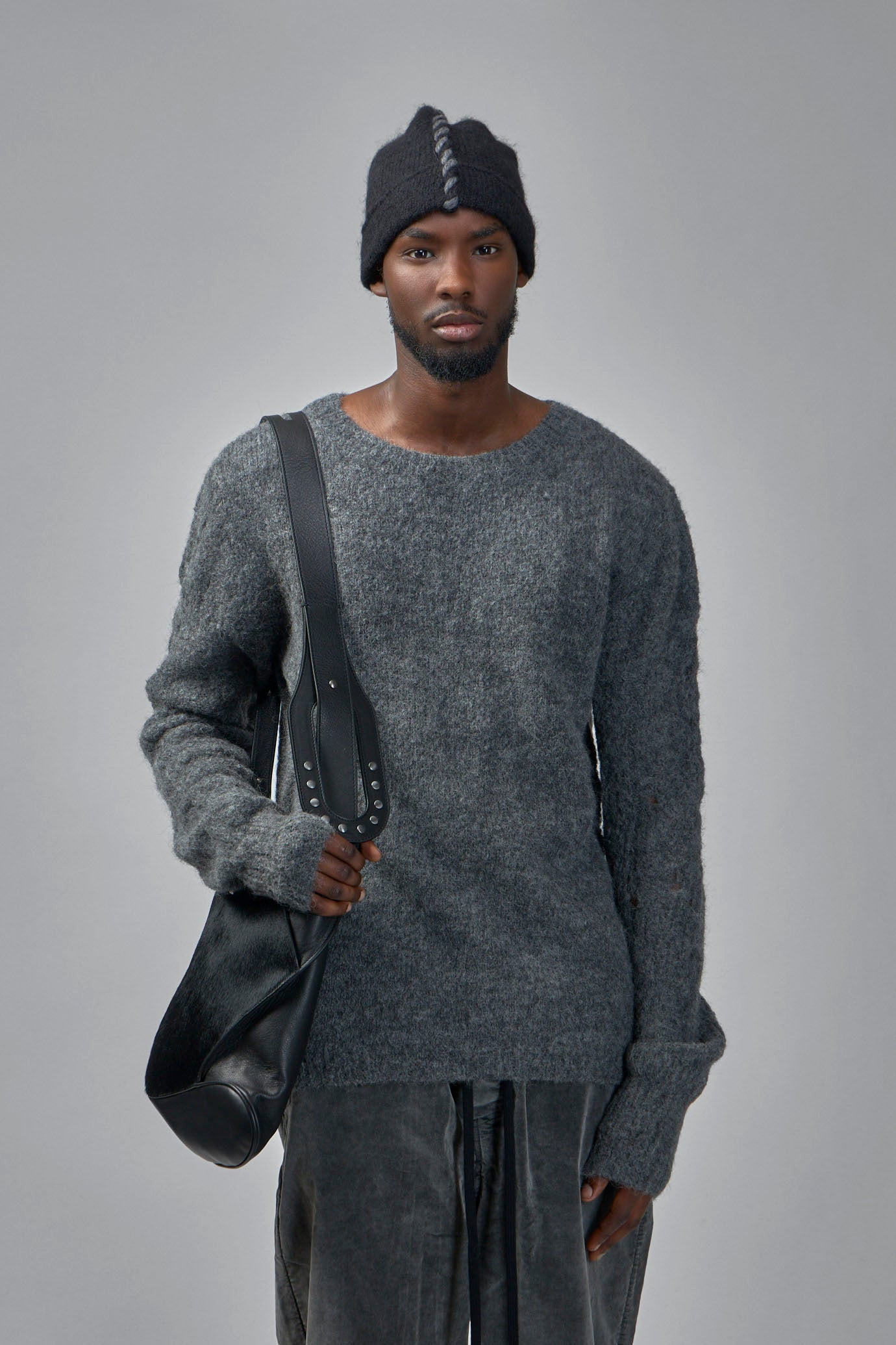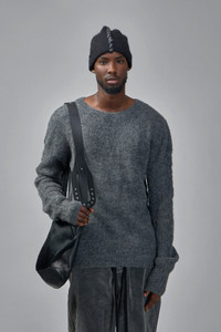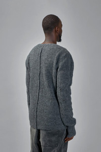 Sweater in a charcoal-grey, brushed knit with a soft, fuzzy surface. It has a crew neckline, long sleeves with extended cuffs, and a relaxed straight hem. A visible raised seam runs down the center back. Materials: 89% Alpaca Wool, 11% Polyamide Color: dark grey melange SKU: 151421 Brand style: M K 122 Size and Fit The model is 1.89m (6.2ft) and wears a size L. The item fits as expected according to standard sizing. Order your usual size.