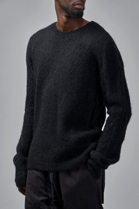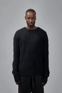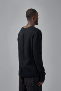 Crewneck pullover in a fuzzy brushed knit with a relaxed, slightly oversized fit. It has long sleeves, ribbed trim and a visible center-back seam for subtle detailing. Materials: 89% alpaca wool 11% polyamide Color: black SKU: 151420 Brand style: M K 122