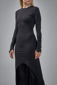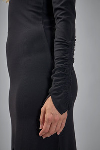 Form-fitting silhouette with a modern, minimalistic design. Long sleeves feature gathered detailing for added texture. The high-low hemline introduces a contemporary twist, perfect for a stylish and sleek appearance. Materials: 72% viscose, 24% polyester, 4% elastane Color: black SKU: 151474 Brand style: W D 52 Size and Fit The model is 1.76m (5.8ft) and wears a size XS. The item fits as expected according to standard sizing. Order your usual size.