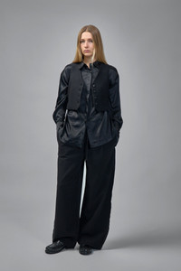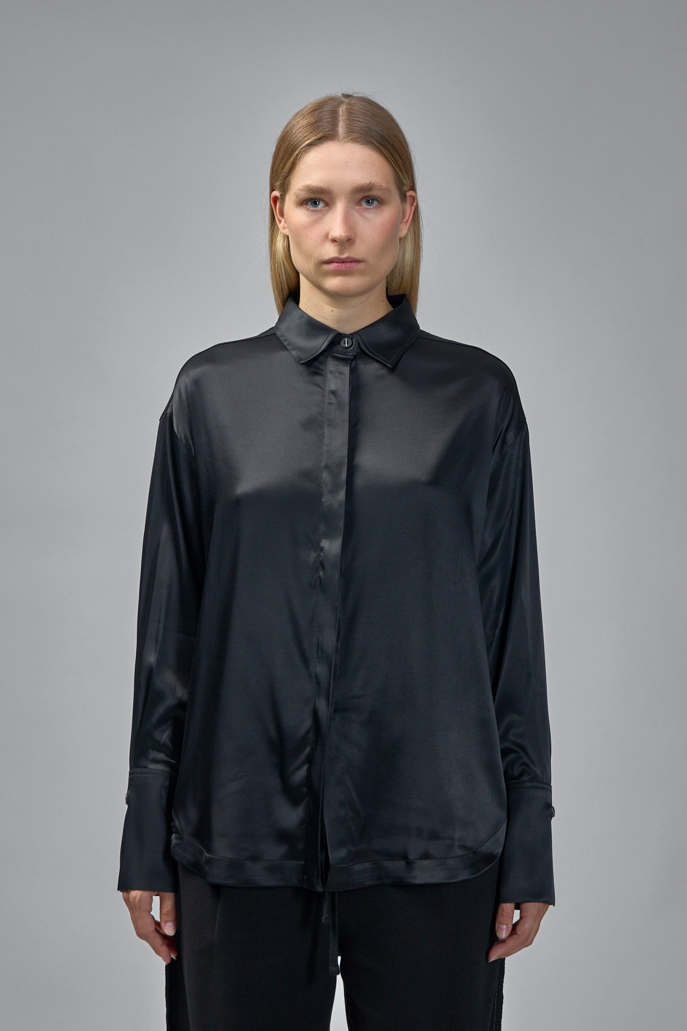 Structured yet comfortable, with a relaxed fit with a smooth, shiny texture. The silhouette is slightly oversized, providing a modern and chic look. It has a classic collar and button-down front, enhancing its versatile style. Materials: 98% Rayon, 2% Elastane Color: black SKU: 151472 Brand style: W H 19 Size and Fit The model is 1.76m (5.8ft) and wears a size S. The item fits as expected according to standard sizing. Order your usual size.