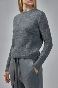 Contemporary proportions and a relaxed fit with a classic round neckline. The texture is soft and fuzzy, providing warmth and comfort. Long sleeves showcase a unique detail with sheer sections, adding a modern touch to the design. Materials: 89% alpaca wool 11% polyamide Color: black SKU: 151466 Brand style: WK147
