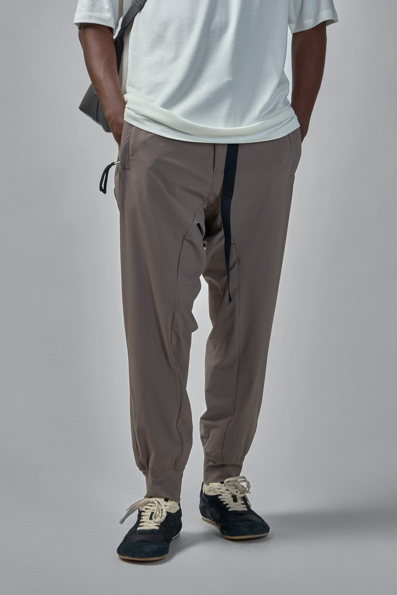 Track pants in matte taupe-brown fabric with an elasticated waistband, integrated webbing belt and cuffed ankles. It features side zip pockets with pull cords and rear welt pockets for storage. Color: earth brown SKU: 151432 Brand style: M P 29
