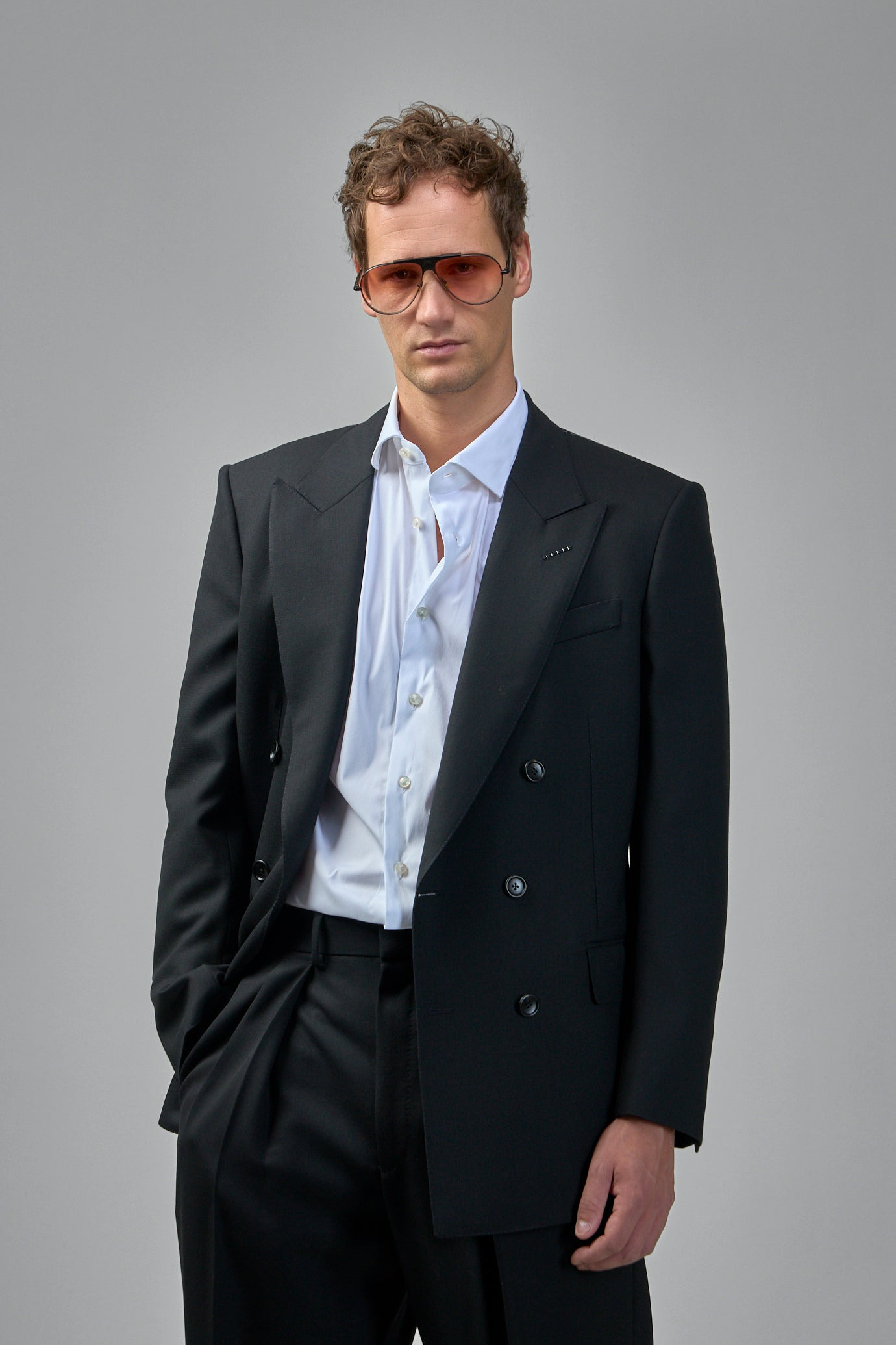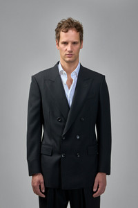 Double-breasted blazer tailoring in black with peak lapels and structured shoulders. It features a six-button front fastening, flap pockets and a chest welt pocket. Clean straight hem and long sleeves complete the refined silhouette. Materials: 100% Wool Color: black SKU: 152911 Brand style: JLNP02-W0056 Size and Fit The model is 1.86m (6.1ft) and wears a size 48. The item has a looser cut but is not necessarily oversized. It’s intended for a comfortable and easy wear.
