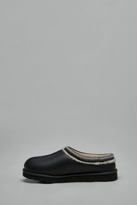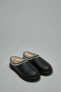 Slip-on designed for comfort, featuring a minimalist black exterior with a plush beige lining. It offers a simple yet stylish look, ideal for casual wear. Materials: Leather upper; UGGbraid made with 100% recycled polyester fibers; 17mm UGGplush™ (60% upcycled wool, 40% TENCEL™ Lyocell, 100% recycled polyester backing) lining; 17mm UGGplush™ 60% upcycled wool, 40% TENCEL™ Lyocell insole; Foam footbed; Sugarcane EVA outsole or Treadlite by UGG™ EVA outsole; Recycled polyester binding Color: blk SKU: 154607 Brand style: 1171303