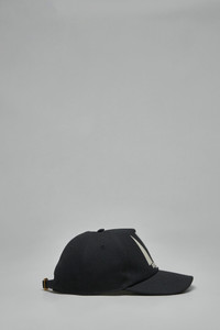 Cap crafted from black canvas with a curved visor and six-panel construction. It features a large white embroidered 'M' motif and CHEZ VALENTINO text on the front, plus an adjustable back strap with a gold-tone metal buckle. Materials: 100% Cotton Color: black SKU: 151805 Brand style: 7Y2HDA41WG