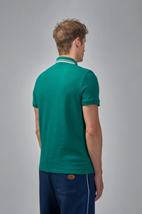 Polo shirt in vibrant teal green with short sleeves and a ribbed collar featuring twin white stripes. It has a three-button placket, a small embroidered chest logo patch, and a fine pique texture for a classic sporty look. Materials: 100% Cotton Color: 157 SKU: 151774 Brand style: 7V3MH01KAQK