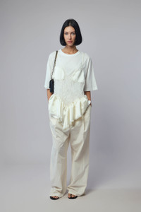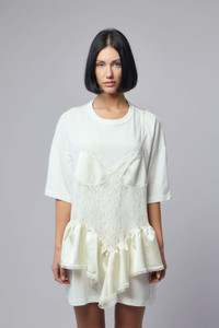SKU: 154667 Brand style: VAQ11T013 T-shirt with an overlay of lace and ruffled satin detailing. The garment combines casual elements with intricate textures for a layered look. - Short sleeves - Round neckline - White base color - Lace overlay - Satin ruffle details - Relaxed fit - Textured fabric contrast Materials: 100% Cotton, 97% Polyester, 3% Spandex, 100% Polyamide Color: White The model is 1.75m (5.7ft) and wears a size S. Intentionally designed with a looser, oversized look. If you prefer a more fitted look, you may opt for a size smaller.