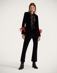 These pants were made for wow-ing. Cut in our stunning Italian velvetwith a cigarette shape, the 24/7 falls between our Hendrix Pant and Saturday Night Pant styles, and is infinitely flattering on all body shapes. Arriving in our infinitely chic solid black, they are designed to pair with the matching 24/7 Jacket but play just as perfectly as a pop of minimalism to a more print powered outfit. Details & Fit - Velvet - Cigarette cut - Slightly flared hem - Jacquard bella - 4 pockets - Ankle crop - Fly button and zip - Equipped with belt loops - 100% Made in Italy - Composition: 100% cotton velvet
