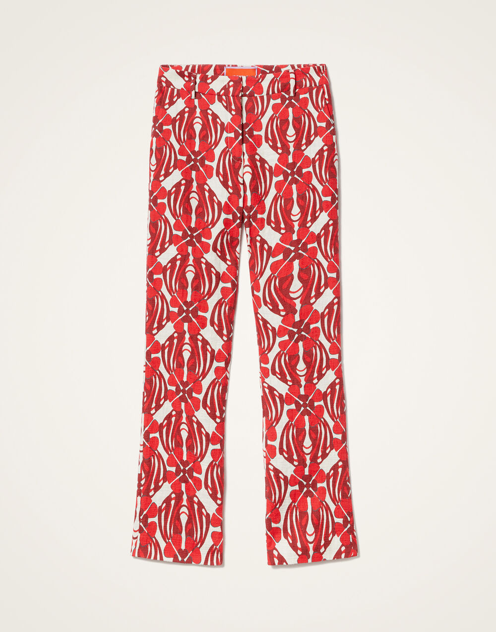 These pants were made for wow-ing. Cut in a cigarette shape, the 24/7 falls between our Hendrix Pant and Saturday Night Pant styles, and is infinitely flattering on all body shapes. Summer-ready in our rustic cotton, they are designed to pair with the matching 24/7 Jacket but play just as perfectly as a pop of maximalism to a more pared down outfit. Details & Fit - Rusti cotton - Cigarette cut - Slightly flared hem - Jacquard bella - 4 pockets - Ankle crop - Fly button and zip - Equipped with belt loops - 100% Made in Italy - Composition: 98% Cotton 2% Elastane - The model is 178 cm / 5′ 10″ tall and wears a size S