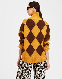 In vibrant intarsia hues and a luxurious boucle alpaca wool blend, this Argyle Sweater is the definition of a feel-good knit. It has tons of comfy details to cozy down in, from its high turtleneck you can leave up or fold down to its strokable texture and long oversized fit. New in this off-beat color combo, it's brilliant with jeans or printed skirts for the weekend, even better with cashmere socks by the fire. Details & Fit - High turtleneck that you can fold or leave up - Intarsia pattern - Ribbed hem and wrists - Dropped shoulders - Long cut - 100% Made in Italy - Composition: 48% Alpaca Superfine 36% Polyacrylic 9% Polyamide 7% Polyester - Garment length: 67cm