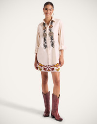 We’ll go ahead and say it - this just might be the perfect shirt. One that’s tailored in all the right places but still oversized enough to feel effortlessly laid back. Embroidered with our majestic in-house designed Nucleus print, this beauty pops with pretty much anything - your favourite pair of jeans, a printed Pencil Skirt, over a bathing suit, or nothing at all! Just keep this one close to the chest….your boyfriend will want to steal it, we guarantee. Details & Fit - Embroidery - Oversized collared button down - Boxy fit - Garment length: 80cm - Composition: 100% Cotton - Made in India - The model is 176 cm / 5′ 9″ tall and wears a size S