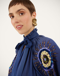 There’s nothing like a little romance to zhuzh up your wardrobe separates. Light, beautiful and unapologetically feminine, the Cerere Blouse is one for your admirers to fall in love with. Its vintage-inspired shape appeals to our whimsy side and is finished with a detachable foulard at the collar that can be tied, styled as a belt or let loose. Arriving in embroidered navy cotton voile, this beauty is a year-round essential. Details & Fit - Oversized Fit - Cotton Voile - Embroidered Detailing - Detachable neck sash secured with loops - V neck - Puff sleeves - Composition: 100% Cotton - Made in India - The model is 176 cm / 5′ 9″ tall and wears a size S