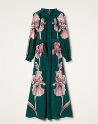 Named after the goddess of abundance, the gorgeous Cerere Dress brims with color and romance. Crafted from ultra lightweight silk voile that drapes like a dream, this floor-sweeping bella has an airy silhouette that can be cinched at the waist with removable sash if more shape is your thing. We love the romance in the little details - buttons at the neck, ruffle collar, puff sleeves - plus this gorgeous dark floral print hand-placed by our Italian craftspeople. Details & Fit - Silk voile - Button collar - Removable sash - Puff sleeves - Elasticated cuffs - Throw on design - Hand-placed print - 100% Made in Italy - Composition: 100% Silk - The model is 175 cm / 5′ 9″ tall and wears a size S