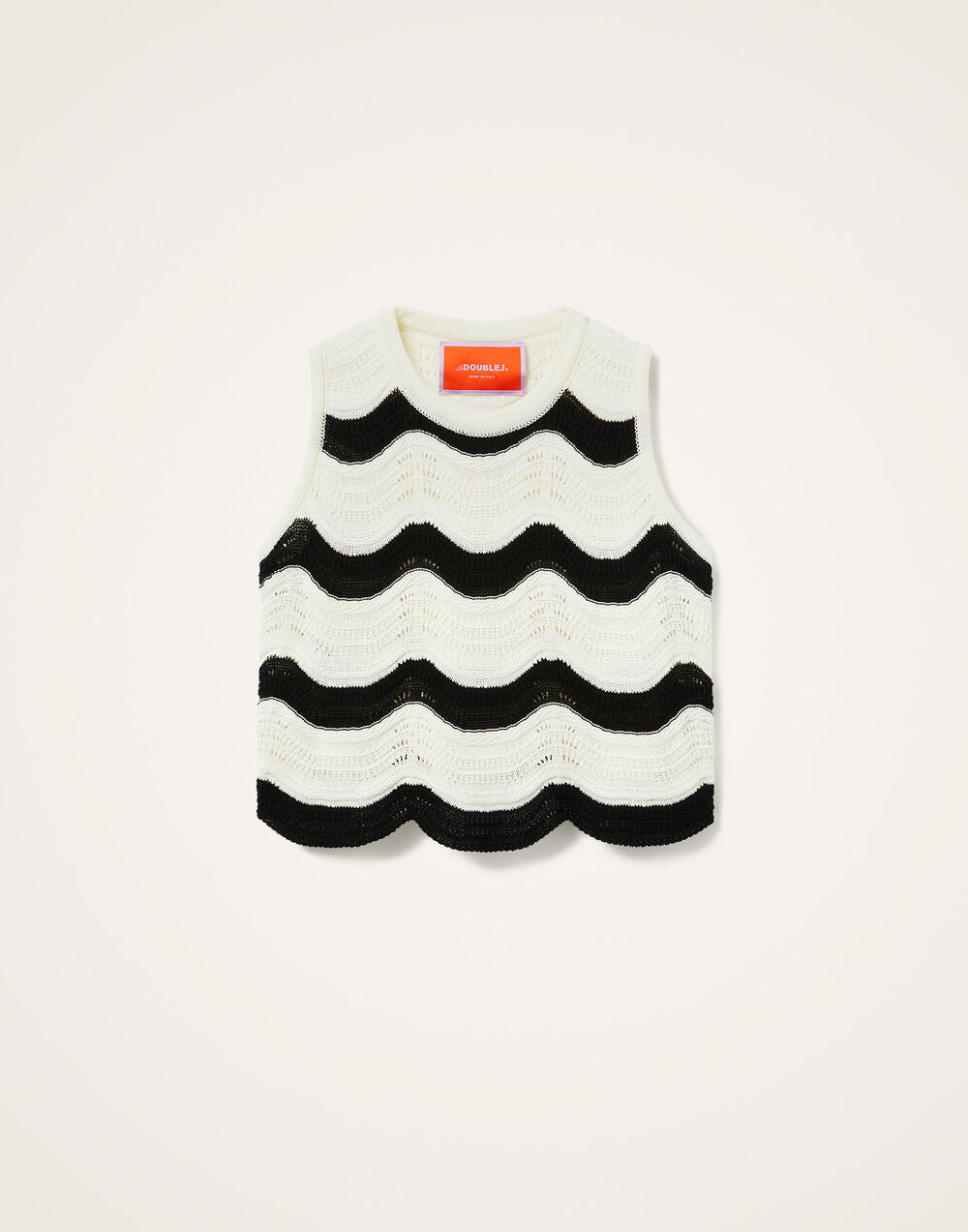 A flirty crochet top with vintage appeal to manifest your own summer of love. Sleeveless with a mock neck, this bella’s flared silhouette is woven in 100% cotton and cropped at the belly button for sassy summer energy. Minimalist? Wear it over your fave white shirt. Maximalist? Go bold with the matching skirt. Details & Fit - Knit chevron - Crop top - Cropped at belly button - Sleeveless - Mock neck - 100% Made in Italy - Composition: 100% Cotton - The model is 178 cm / 5′ 10″ tall and wears a size S